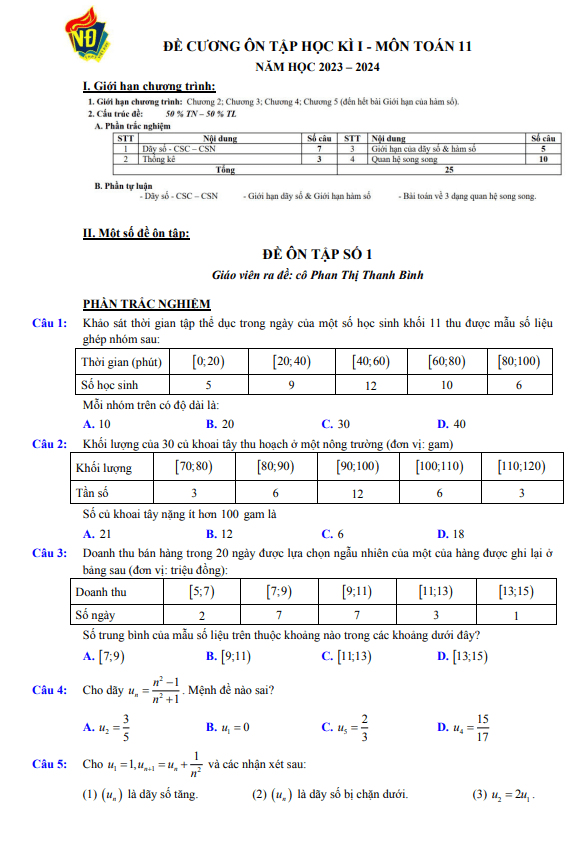 Cấu trúc của đề bài phân chia thành 50% câu hỏi trắc nghiệm và 50% câu hỏi tự luận. Phần trắc nghiệm bao gồm các chủ đề như Dãy số, Cấp số cộng – cấp số nhân, Thống kê, Giới hạn của dãy số và hàm số, Quan hệ song song. Phần tự luận bao gồm các chủ đề như Dãy số, Giới hạn của dãy số và hàm số, Bài toán về quan hệ song song.