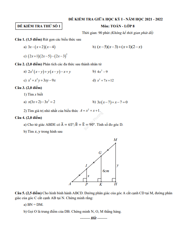 05 đề ôn tập kiểm tra giữa học kì 1 (HK1) lớp 8 môn Toán năm học 2021 2022
