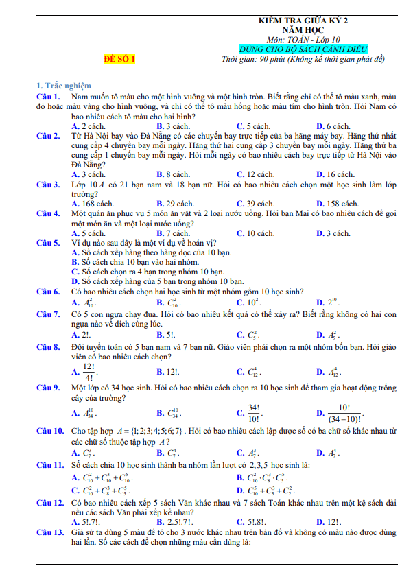 Trang web Sytu xin giới thiệu đến quý thầy cô và các em học sinh lớp 10 tài liệu chọn lọc gồm 10 đề kiểm tra giữa học kỳ 2 môn Toán lớp 10, dành cho bộ sách giáo khoa Cánh Diều. Các đề thi này đều đi kèm đáp án và lời giải chi tiết, giúp các em ôn tập và kiểm tra kiến thức một cách hiệu quả.Đặc điểm của các đề kiểm tra này là hình thức 70% trắc nghiệm (35 câu) kết hợp với 30% tự luận (4 câu), thời gian làm bài là 90 phút (không tính thời gian phát đề). Các đề thi đã được biên soạn cẩn thận và phong phú về nội dung, giúp học sinh rèn luyện kỹ năng giải bài toán và áp dụng kiến thức vào thực hành.Một số ví dụ về nội dung của các đề thi bao gồm việc tính số cách tô màu cho hai hình, xác định số cách bay trực tiếp từ Hà Nội vào Đà Nẵng, tính vectơ từ các vectơ đã cho, viết phương trình đường cao và đường trung bình của tam giác, xác định số người tham dự sự kiện dựa vào số cặp bắt tay và đề bài về việc tổ chức giải bóng đá cho các trường THPT.Tài liệu cung cấp trong dạng file WORD để quý thầy, cô giáo dễ dàng sử dụng và chỉnh sửa theo nhu cầu. Hy vọng rằng tài liệu này sẽ giúp các em học sinh lớp 10 tự tin hơn trong việc chuẩn bị và đối phó với các kỳ kiểm tra sắp tới. Hãy truy cập trang web của chúng tôi để tải về tài liệu và bắt đầu ôn tập ngay hôm nay!