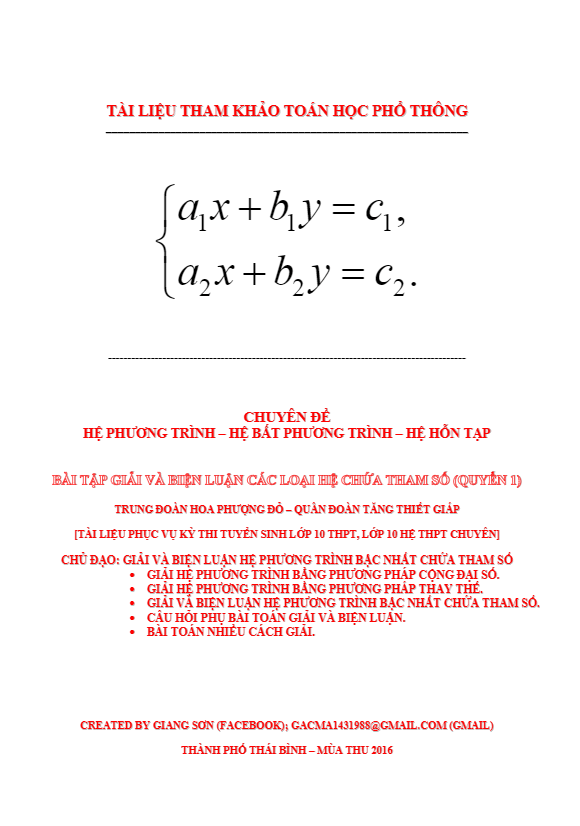 Tuyển tập 108 bài toán giải và biện luận hệ phương trình bậc nhất chứa tham số Lương Tuấn Đức