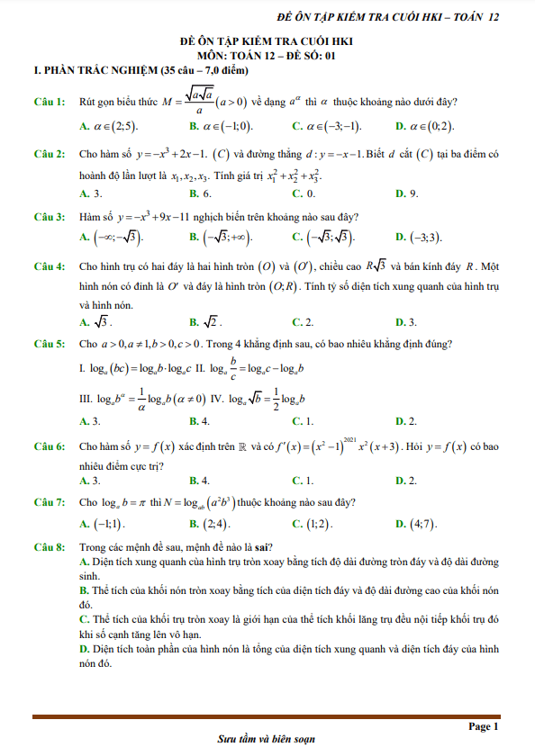 12 đề ôn tập kiểm tra cuối học kì 1 môn Toán lớp 12 (70% TN + 30% TL)