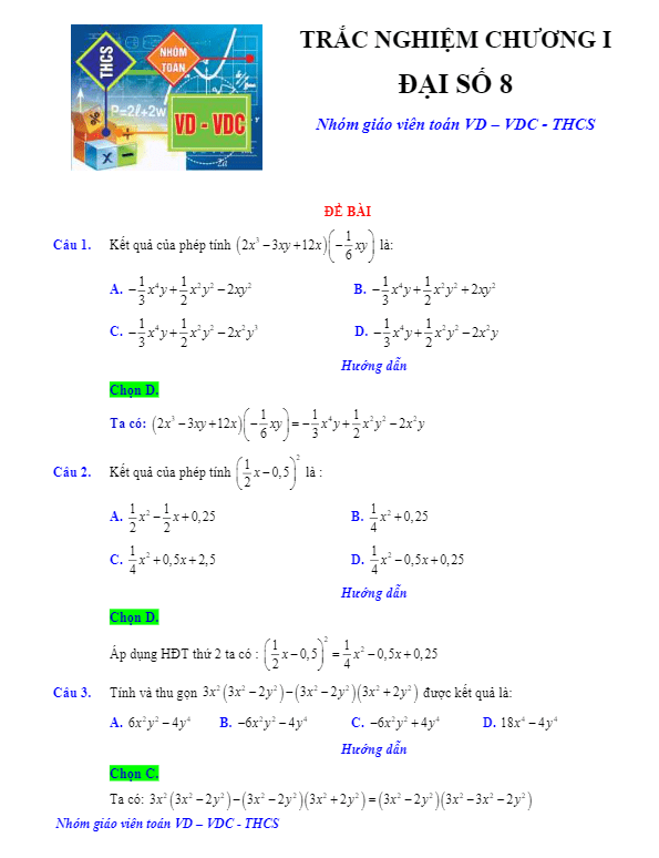 Sytu xin giới thiệu đến quý thầy cô và các em học sinh bộ tài liệu 350 bài tập trắc nghiệm về phép nhân và phép chia các đa thức. Bộ tài liệu này được biên soạn bởi nhóm Toán VD – VDC THCS gồm 102 trang, bao gồm đáp án và lời giải chi tiết. Đây là tài liệu hữu ích để giúp các em học sinh lớp 8 rèn luyện kỹ năng khi học chương trình Đại số 8 chương 1.