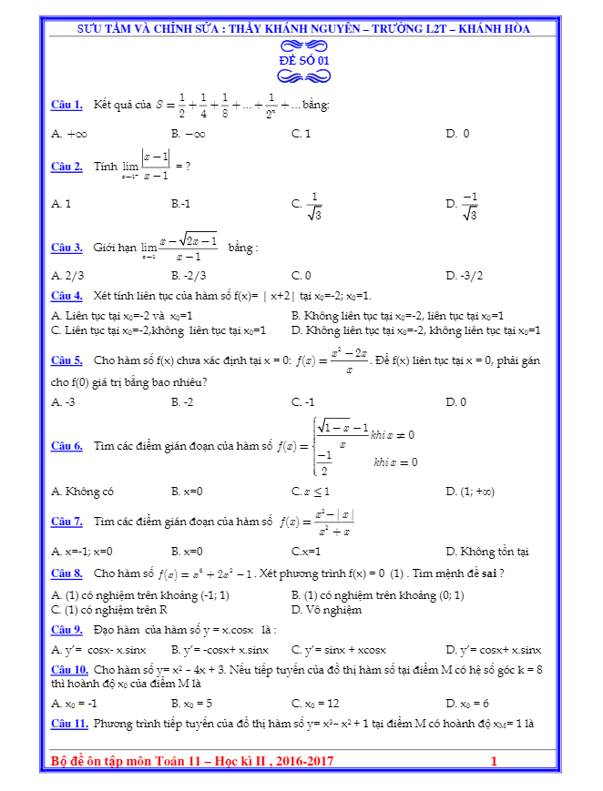 5 đề ôn tập thi học kì 2 (HK2) lớp 11 môn Toán Nguyễn Khánh Nguyên