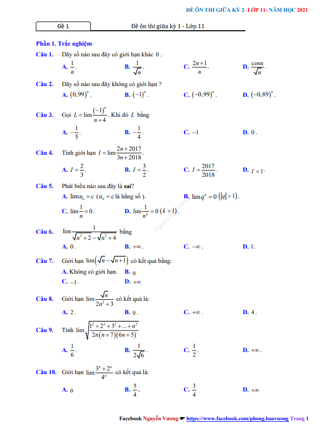 Tài liệu ôn thi giữa kỳ 2 Toán lớp 11 Nguyễn Bảo Vương