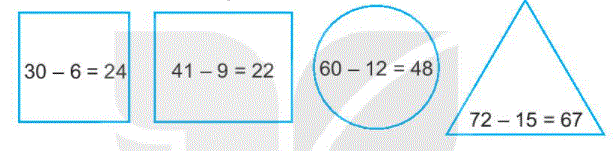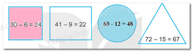 – Đặt tính rồi tính (hoặc tính nhẩm) kết quả các phép trừ rồi tô màu vào các hình theo yêu cầu của bài toán.