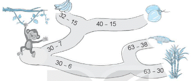 Tại mỗi ngã rẽ, bạn khỉ sẽ đi theo con đường ghi phép tính có kết quả nhỏ hơn. Khoanh vào món ăn mà bạn khỉ sẽ đến.