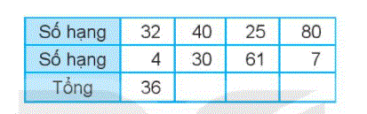 Ta lấy số hạng cộng số hạng rồi viết tổng 2 số vào ô trống cho thích hợp.
