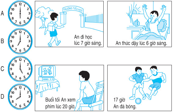 Tranh 4: 17 giờ An đá bóng ứng với đồng hồ C.