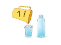 Đổ hết nước từ ca 1l được đầy một chai và một cốc (như hình vẽ)