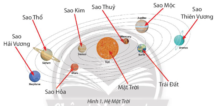 Trao đổi với bạn để chỉ ra vị trí Mặt Trời, các hành tinh trong hệ Mặt Trời ở Hình 1.