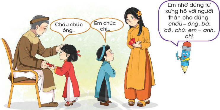 Hãy cùng các bạn trong nhóm đóng vai người thân trong gia đình để chúc Tết nhau.