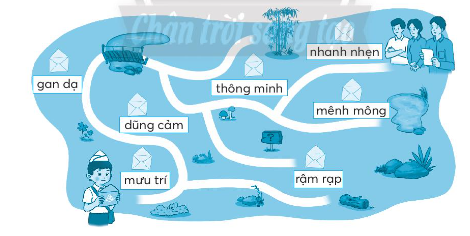 Em hãy quan sát bức tranh và giúp bạn nhỏ tìm đường đưa thư có các bức thư ghi từ ngữ chỉ phẩm chất đó tô màu cho phù hợp.