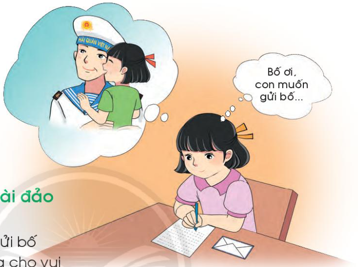 Phân tích và giải bài 2: Thư gửi bố ngoài đảo trang 128 SGK Tiếng Việt lớp 1 tập 2 Chân trời sáng tạo. Theo em, bố của bạn gái trong tranh là ai. Thư gửi bố ngoài đảo. Tìm ngoài bài thơ từ ngữ chứa tiếng có vần oai, oay. Bạn nhỏ trong bài thơ muốn gửi gì cho bố…Theo em, bố của bạn gái trong tranh là ai?