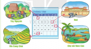 Câuhỏi: Xem tờ lịch và các ảnh chụp của Rô-bốt rồi trả lời câu hỏi (theo mẫu)