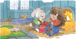 Mùa đồn, thỏ quấn tấm vải lên người cho đỡ rét thì gió thổi tấm vải bay xuống ao. Nhím giúp thỏ khều tấm vải vào bờ và nói:
