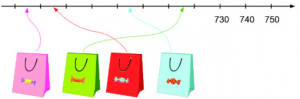 Quan sát tia số đã cho và dựa vào nhận xét ta có kết quả: Túi màu xanh lá có nhiều kẹo nhất và túi màu hống có ít kẹo nhất.