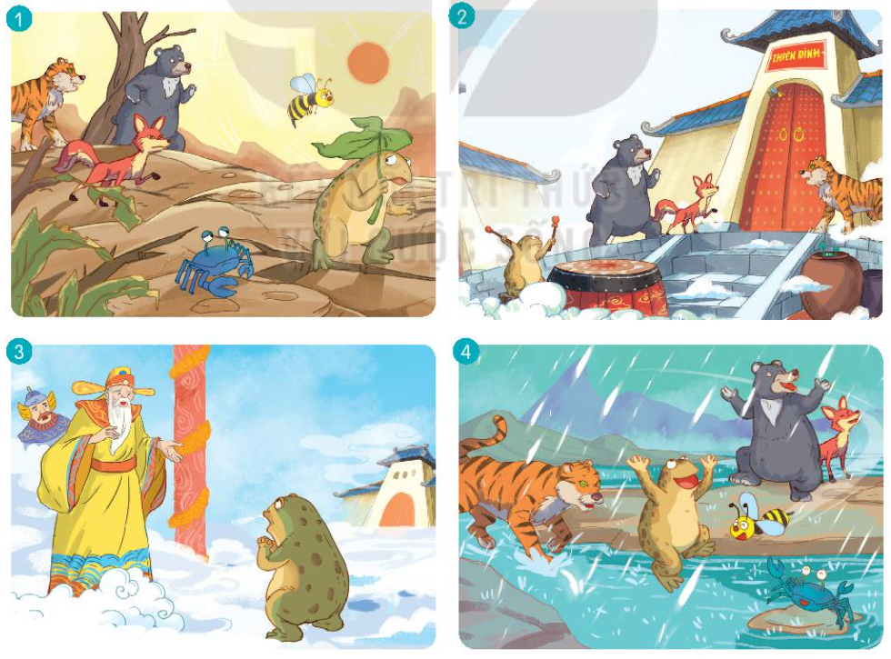 Em quan sát kĩ các bức tranh và dựa vào câu chuyện Cóc kiện Trời đã được học để nói về sự việc diễn ra trong từng bức tranh.