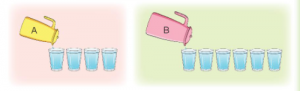 Rót hết nước từ bình A và bình B được các cốc nước (như hình vẽ)