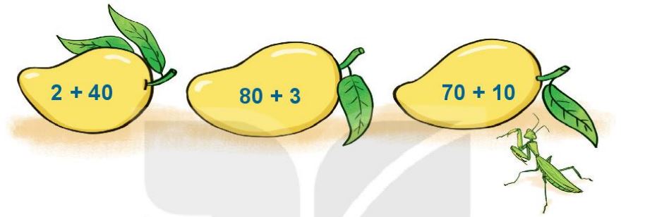 Vì 42 < 80 < 83 nên quả xoài ghi phép tính 80 + 3 có kết quả lớn nhất, quả xoài ghi phép tính 2 + 40 có kết quả bé nhất.