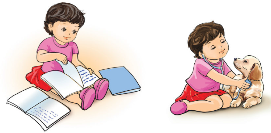 Bé Chi chăm chỉ lắm. Bé đi khắp nhà. Khi thì bé mở vở của chị, ê a. Khi thì bé đi xe đạp. Khi thì bé khám cho chó Lu. Lu “gừ gừ” có vẻ thú vị lắm.