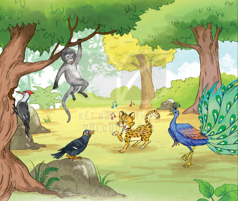 a. Trong tranh có voọc xám, chim gõ kiến, chim yểng, chim công, mèo rừng.