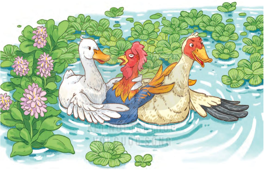 Trong tranh là hình ảnh hai bạn vịt đang giúp bạn gà khi bạn gà bị rơi xuống nước.