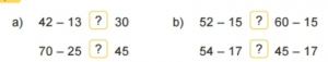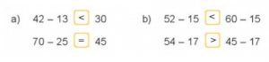 Giải bài 4 trang 91 Toán lớp 2 tập 1 Sách Kết nối tri thức và cuộc sống – Bài 23: Phép trừ ( có nhớ) số có hai chữ số cho số có hai chữ số – Phần luyện tập Câu hỏi: Điền dấu ><= Giải:
