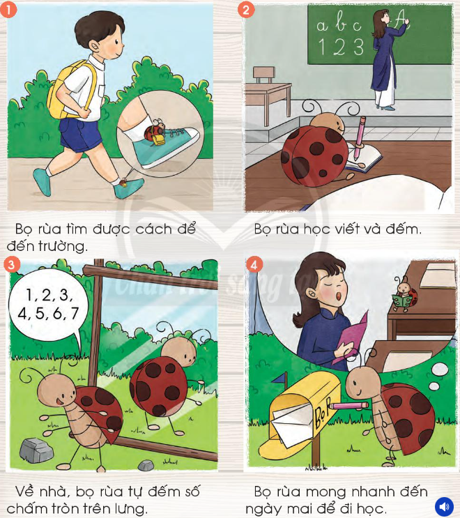 Đến lớp, Bọ Rùa chui vào một góc bàn và lấy vở ra học. Cô giáo viết “a, b, c…” lên bảng. Bọ Rùa hí hoáy viết theo. Rồi cô dạy đếm: “1, 2, 3…”. Bọ Rùa đếm theo.