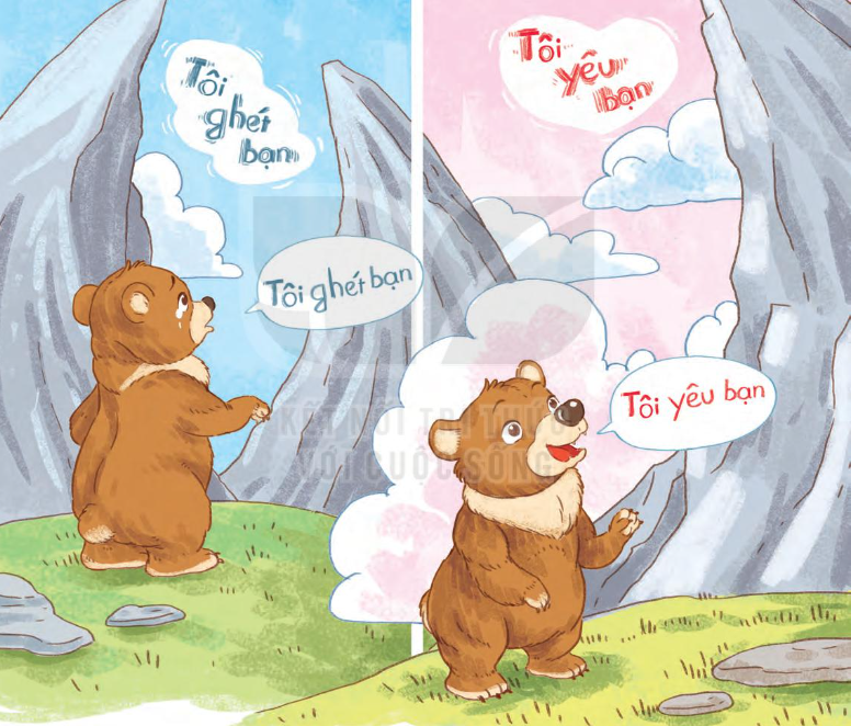 Về nhà, gấu con kể cho mẹ nghe. Gấu mẹ cười bảo: “Con hay quay lại và nói với núi: Tôi yêu bạn.”. Gấu con làm theo lời mẹ. Quả nhiên, có tiếng vọng lại: “Tôi yêu bạn.”. Gấu con bật cười vui vẻ.