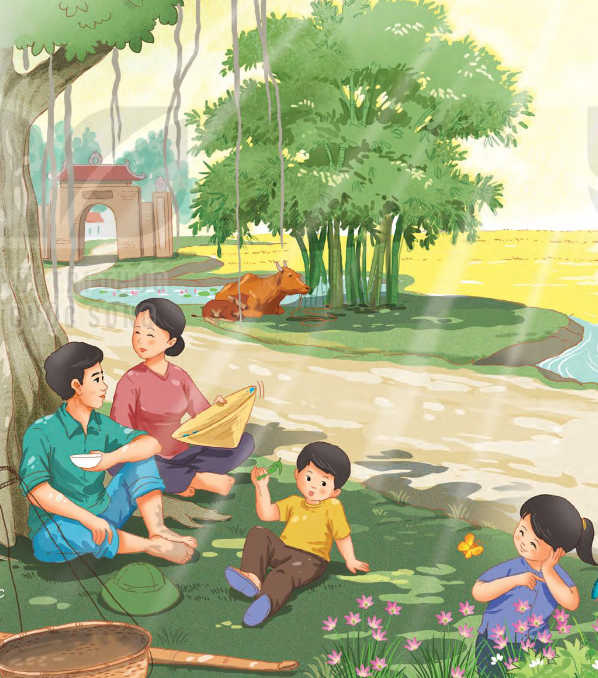 a. Em thấy cảnh đồng quê. Mọi người ngồi nghỉ dưới bóng mát của cây cổ thụ.