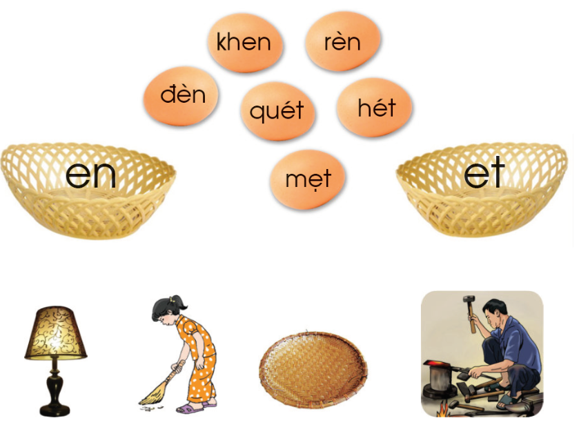 Rổ trứng chứa vần en là: khen, rèn, đèn