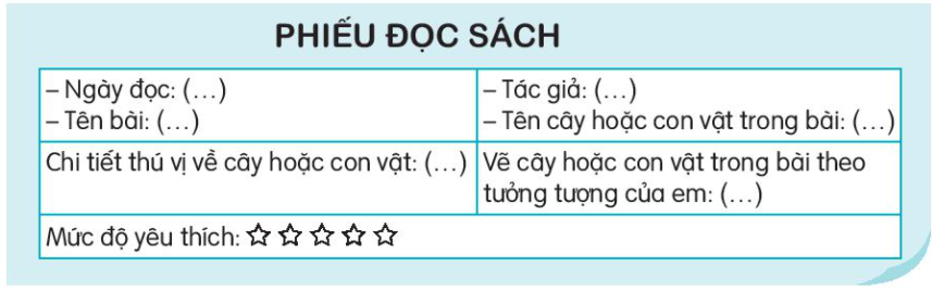 Đọc bài về cây cối, muông thú,… và phiếu đọc sách theo mẫu.