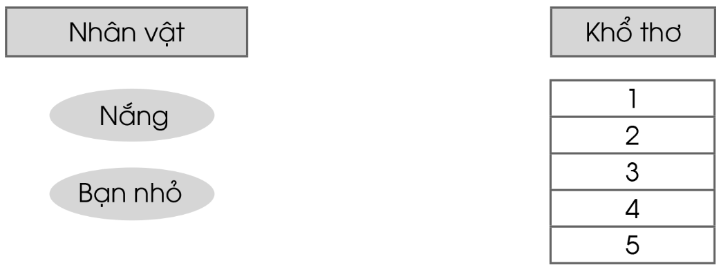Bài thơ có hai nhân vật là bạn nhỏ và nắng. Mỗi nhân vật được nói đến trong những khổ thơ nào? Nối đúng: