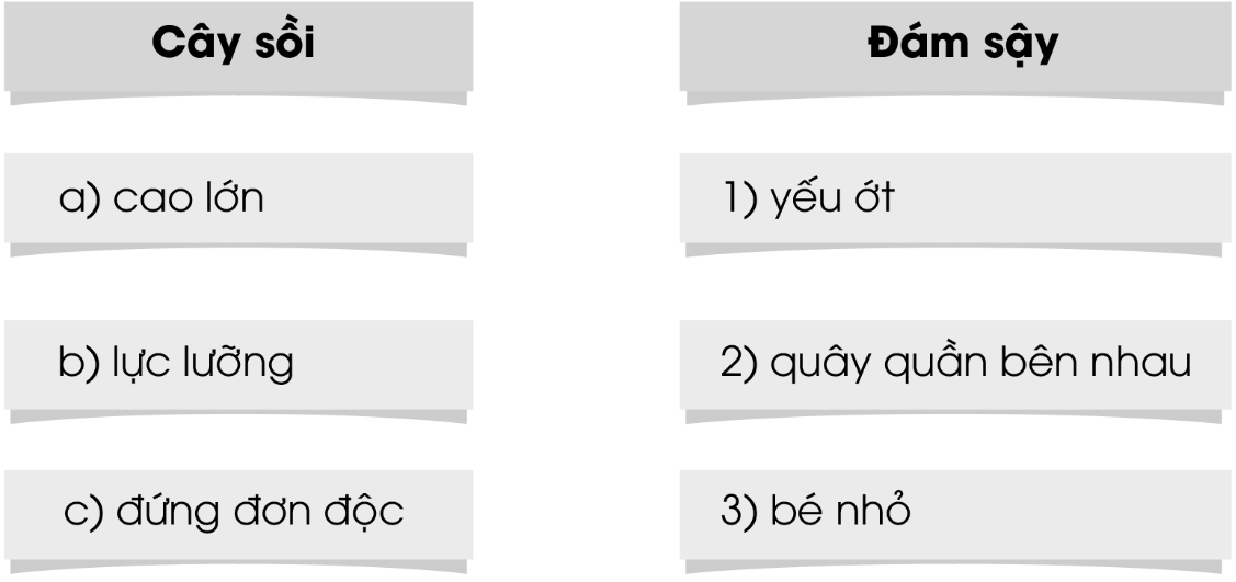 Nối đúng để được các cặp từ ngữ nói lên những đặc điểm trái ngược nhau giữa cây sồi và đám sậy: