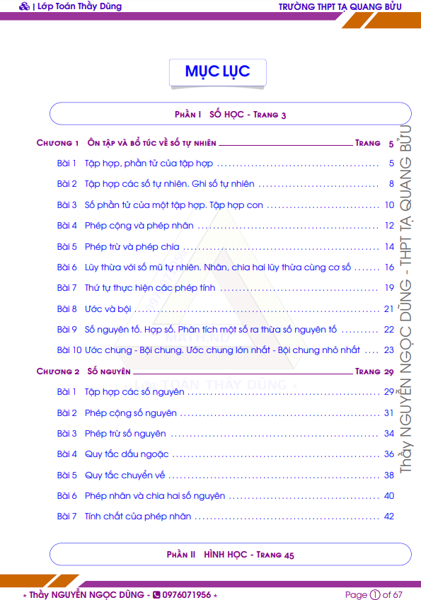 Trong tài liệu này, thầy giáo Nguyễn Ngọc Dũng đã biên soạn 67 trang tài liệu, tóm tắt lý thuyết và chọn lọc các bài tập Toán lớp 6 trong giai đoạn học kì 1 (HK1).