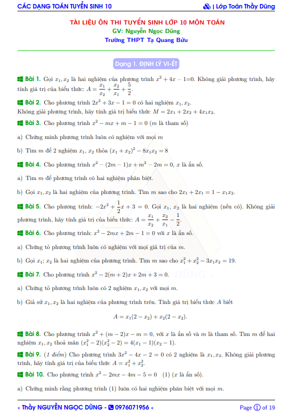 Bài tập ôn thi tuyển sinh vào môn Toán do thầy giáo Nguyễn Ngọc Dũng (giáo viên Toán trường THPT Tạ Quang Bửu, thành phố Hồ Chí Minh) biên soạn gồm 19 trang, được phân dạng và tuyển chọn các bài tập ôn thi tuyển sinh vào lớp 10 môn Toán.