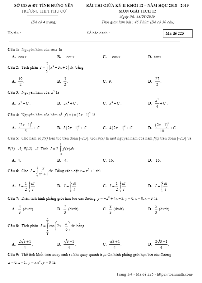 Đề thi giữa kỳ 2 môn Giải tích 12 năm 2018 – 2019 của trường THPT Phù Cừ – Hưng Yên có mã đề 255, bao gồm 30 câu trắc nghiệm trải qua 04 trang đề thi. Thời gian làm bài được quy định là 45 phút. Bài kiểm tra tập trung vào chủ đề về nguyên hàm, tích phân và ứng dụng (chương 3 của Giải tích 12) cùng số phức (chương 4 của Giải tích 12). Đề thi cung cấp đáp án để thí sinh tự kiểm tra sau khi làm bài.