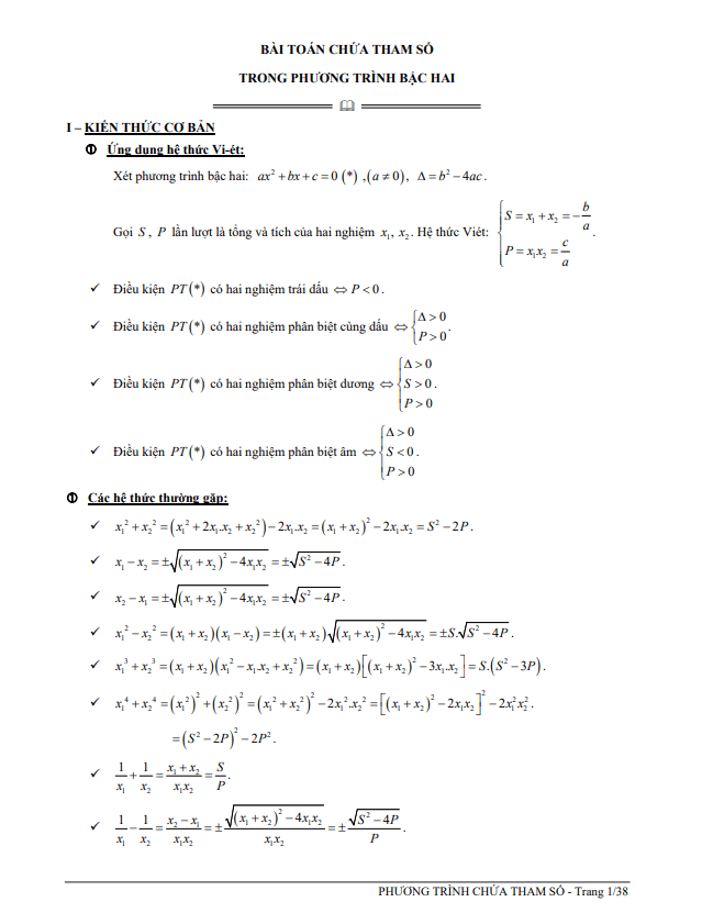 2. Liệt kê các hệ thức thường gặp khi giải bài toán chứa tham số trong phương trình bậc hai.