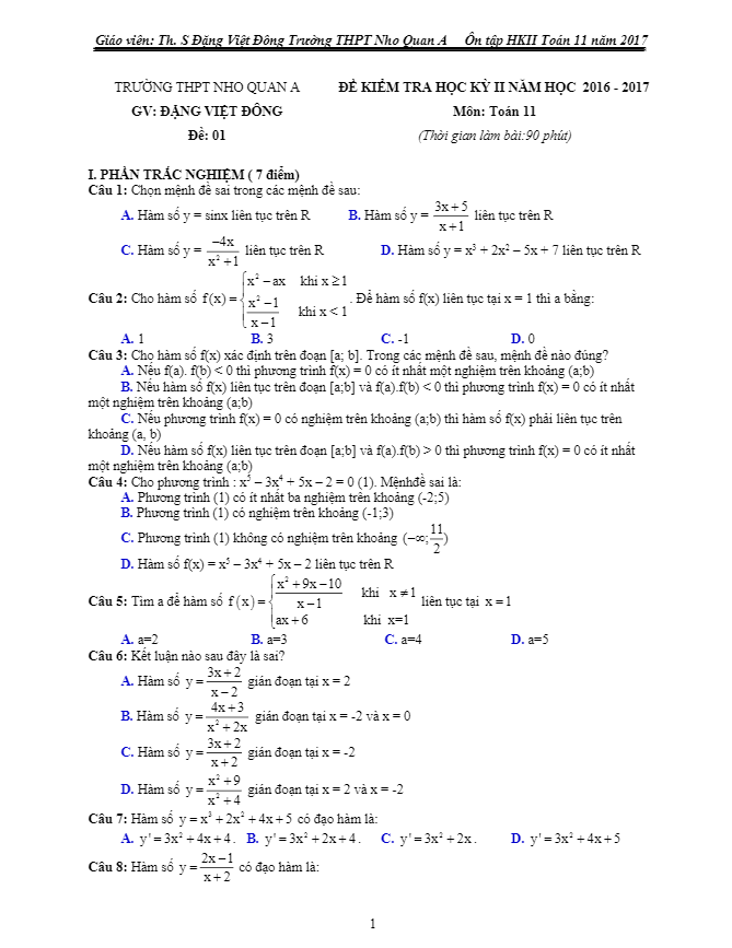 Bộ đề ôn tập học kỳ 2 (HK2) lớp 11 môn Toán năm học 2016 – 2017 trường THPT Nho Quan A Ninh Bình