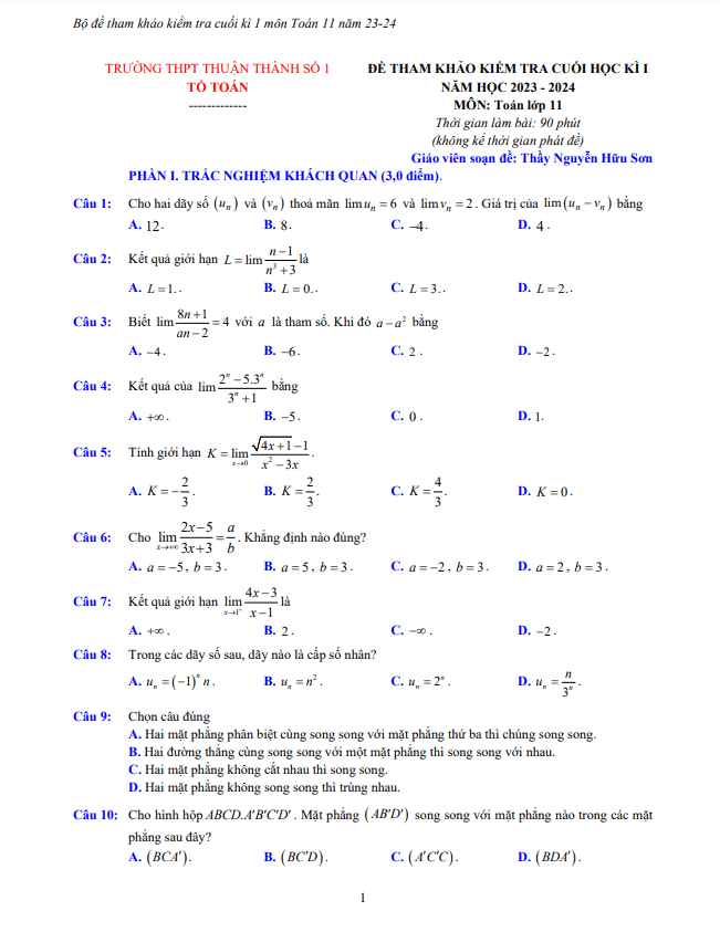 Sytu xin gửi đến quý thầy cô và các em học sinh lớp 11 bộ đề tham khảo cuối học kì 1 môn Toán lớp 11 năm học 2023 – 2024 trường THPT Thuận Thành 1, tỉnh Bắc Ninh. Đề thi này được biên soạn bởi các thầy cô: Thầy Nguyễn Hữu Sơn, Thầy Nguyễn Chí Khôi, Cô Nguyễn Thị Trang, Cô Vương Hải Linh.
