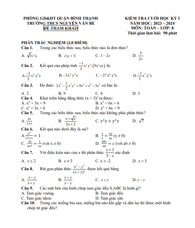 Bộ đề tham khảo cuối học kì 1 (HK1) lớp 8 môn Toán năm 2023 2024 phòng GD ĐT Bình Thạnh TP HCM