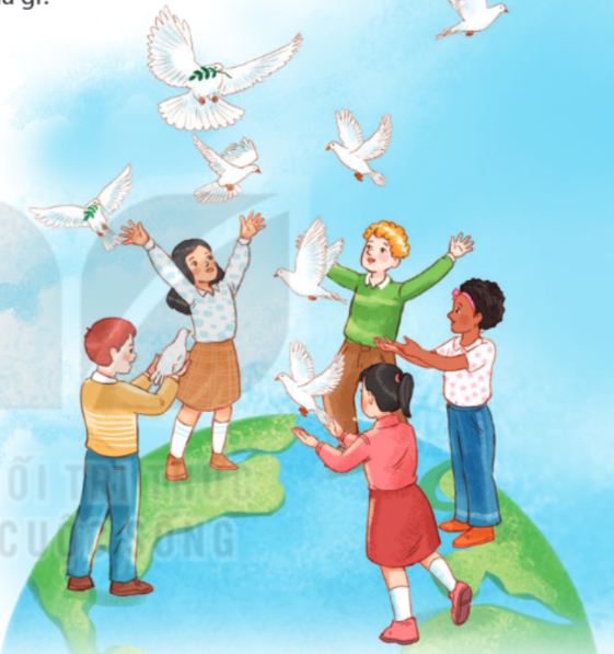 Bức tranh dưới đây vẽ cảnh các bạn nhỏ có màu da khác nhau đang vui đùa với những chú chim bồ câu trắng trên trái đất. Theo em, hình ảnh bồ câu trắng trong bức tranh có ý nghĩa tượng trưng cho sự hòa bình.