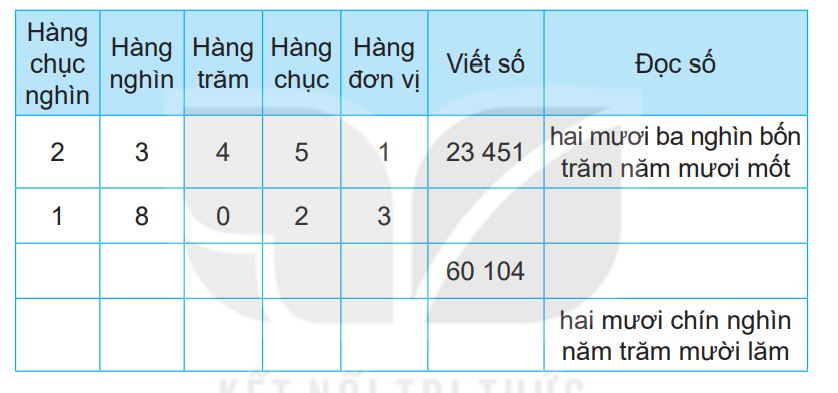 Viết số (hoặc đọc số) lần lượt từ trái sang phải từ hàng chục nghìn, hàng nghìn, hàng trăm, hàng chục, hàng đơn vị.