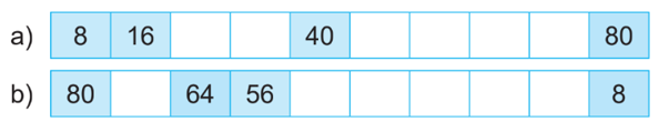 Đếm thêm 8 đơn vị hoặc đếm lùi 8 đơn vị rồi điền số còn thiếu vào ô trống.