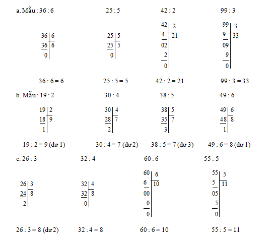 1. Tính rồi viết (theo mẫu) . Câu 1, 2, 3 trang 36 Vở bài tập (SBT) Toán 3 tập 1 – Bài 28. Phép chia hết và phép chia có dư