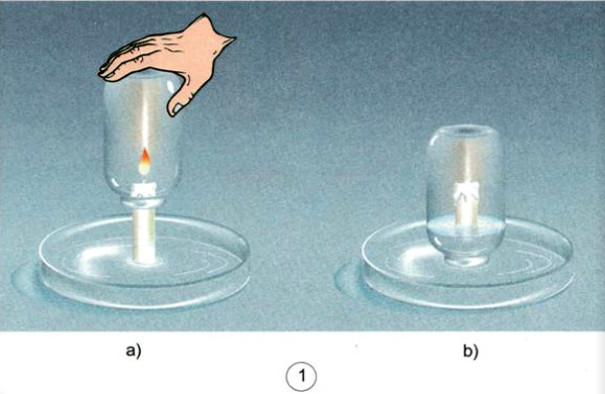 Đốt cháy một cây nến, gắn vào một đĩa thủy tinh rồi rót nước vào đĩa. Lấy lọ thủy tinh úp lên cây nến đang cháy (như hình 1) |