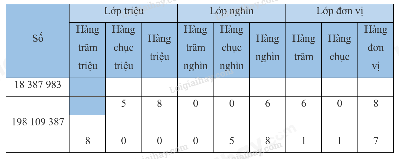 – Viết số lần lượt từ hàng trăm triệu, hàng chục triệu, hàng triệu, hàng trăm nghìn, hàng chục nghìn, hàng nghìn, hàng trăm, hàng chục, hàng đơn vị.