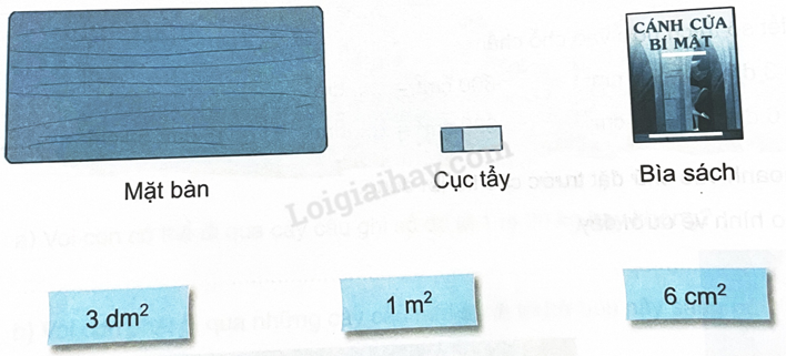 Quan sát tranh rồi nối mỗi đồ vật với số đo thích hợp. Trả lời Câu 2 – Bài 18. Đề-xi-mét vuông – mét vuông – mi-li-mét vuông (tiết 2) trang 52.