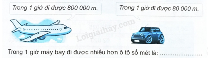 Trong 1 giờ máy bay đi được nhiều hơn ô tô số mét là: 800 000 – 80 000 = 720 000 (m)