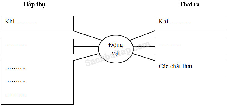 Câu 2 trang 84 VBT Khoa học 4: Đánh mũi tên và điền tên các chất còn thiếu vào chỗ … để hoàn thành sơ đồ trao đổi chất ở động vật.